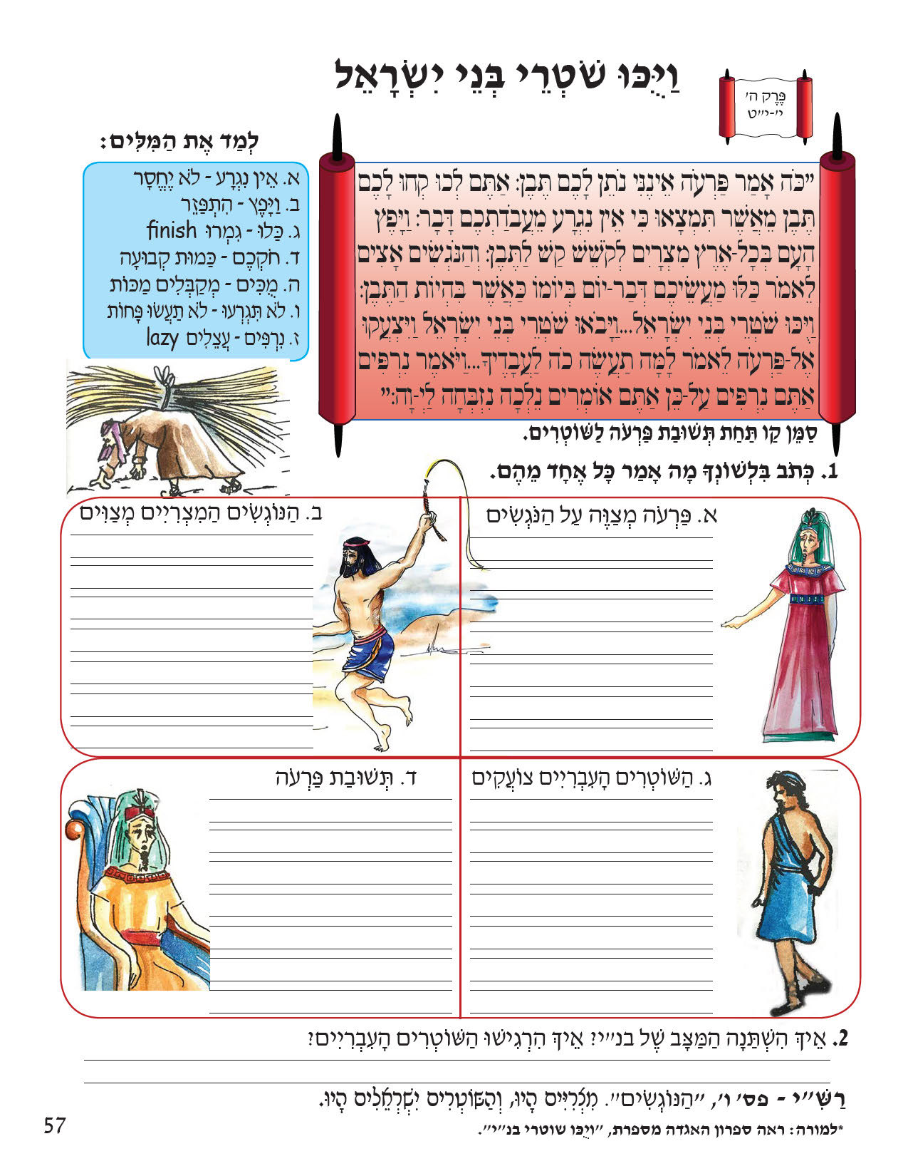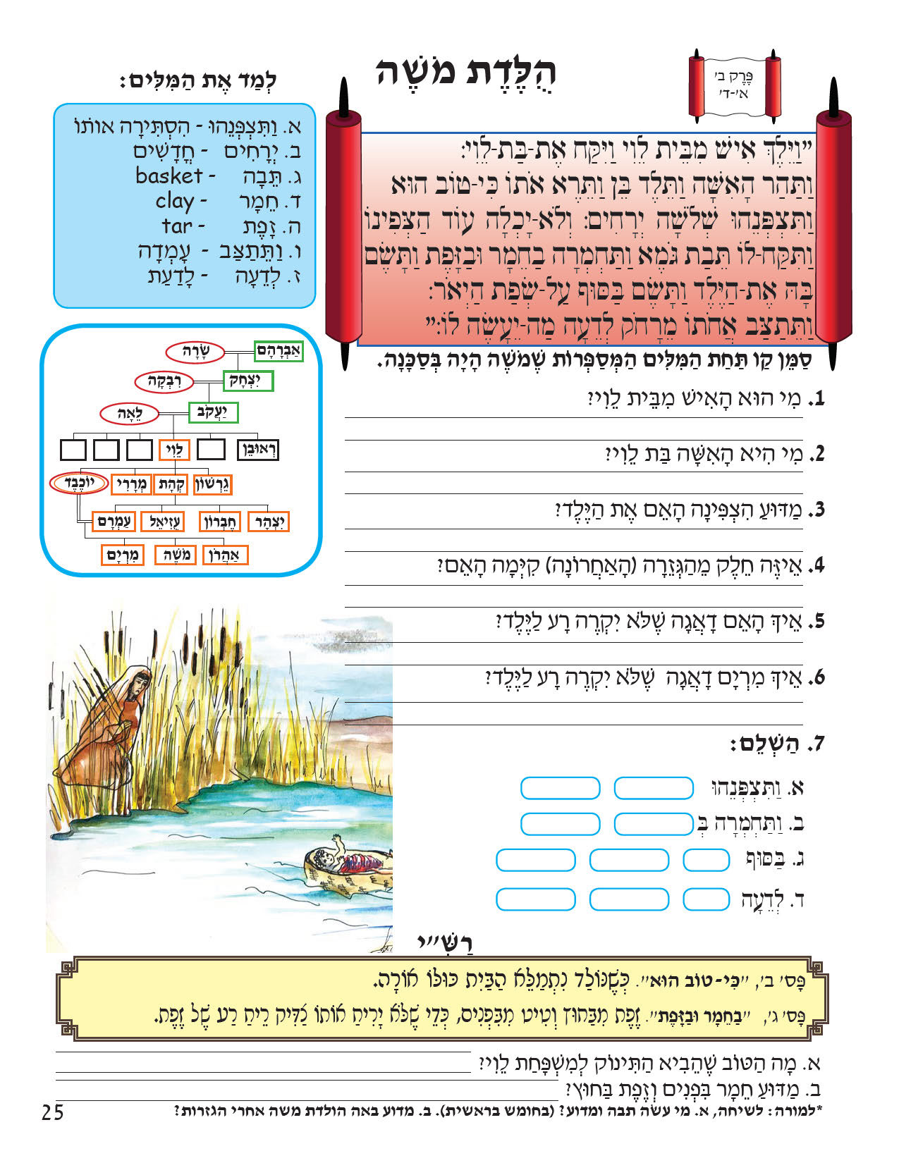 The students will learn the Biblical Text with vocabulary translated from Hebrew to English. Colorful illustrations that correspond to the text appear on every page. There are Assessment Pages, comparisons, role-playing activities, games, puzzles, some of Rashi’s commentaries, a word dictionary, as well as a complimentary booklet of Midrashim at the end of the workbook.